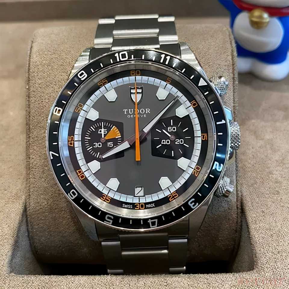 黑、白、灰三种颜色相辅相成,橙色元素点缀彰显运动活力,两个计时盘位于两侧与灰色盘面相呼应,劳力士的经典熊猫盘设计,但这款帝舵更具年轻时尚,42mm表盘大胆撞色拼接,霸气十足!