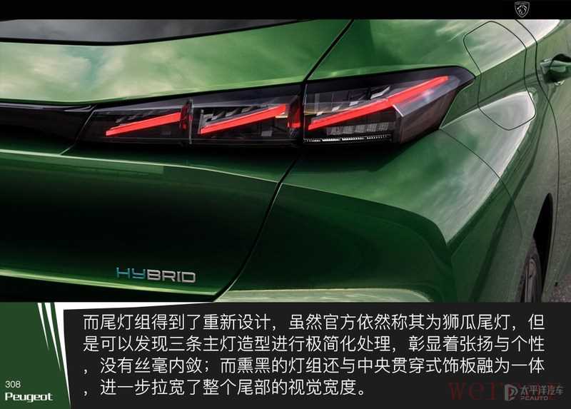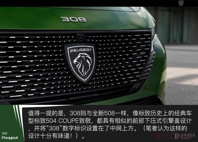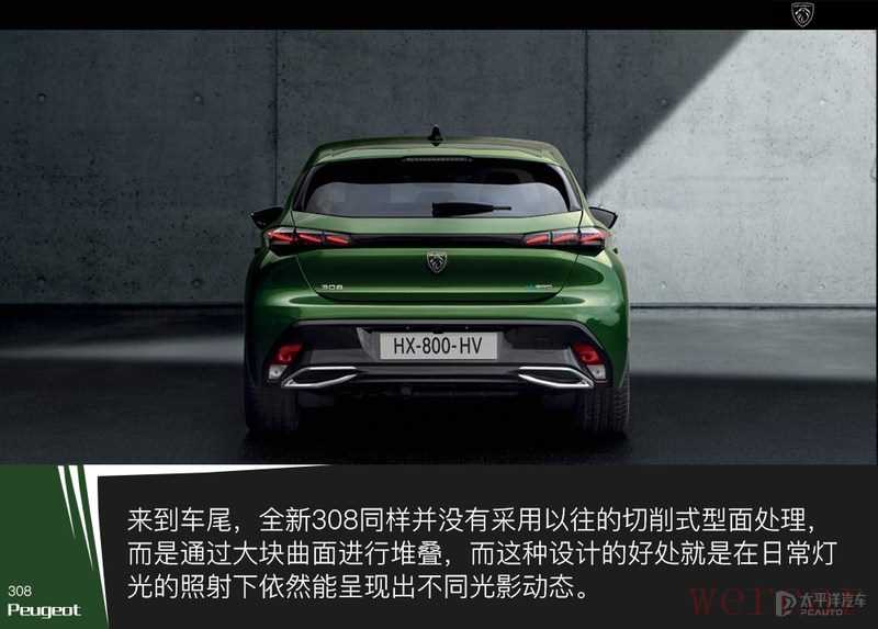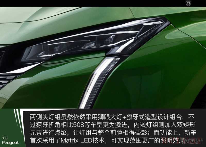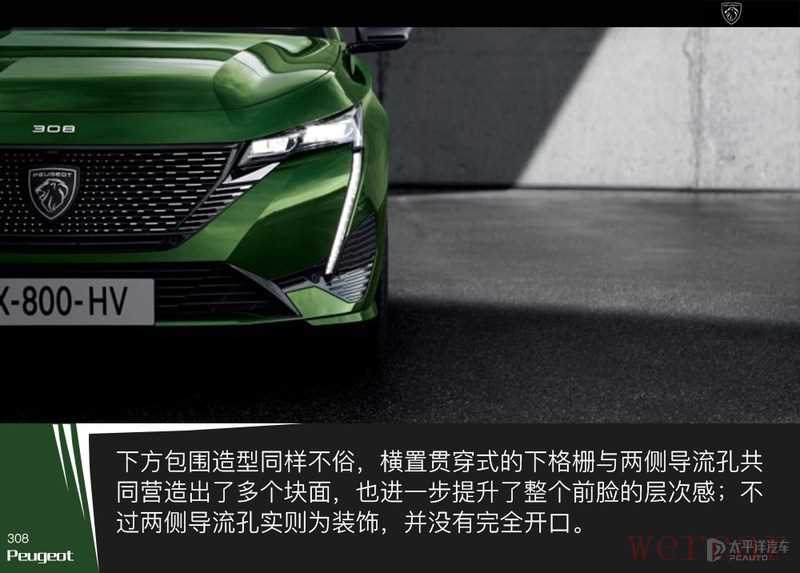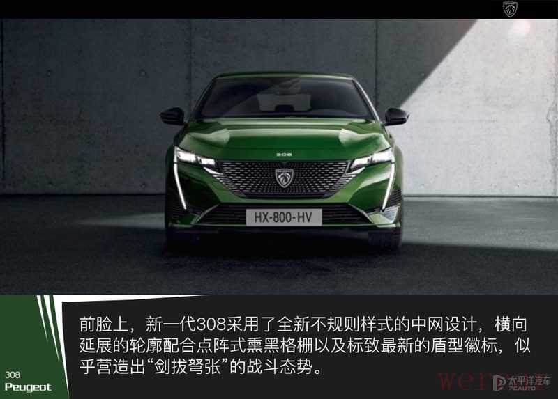 1. "设计语言:" 新308采用了标致最新的“Vision Engine”设计理念,整体造型更加前卫、凌厉,线条流畅且富有科技感。与以往相比,它看起来更加锐气和动感,不再是传统意义上那种略显臃肿或中庸的设计,这在视觉上就提升了产品的价值感和竞争力。