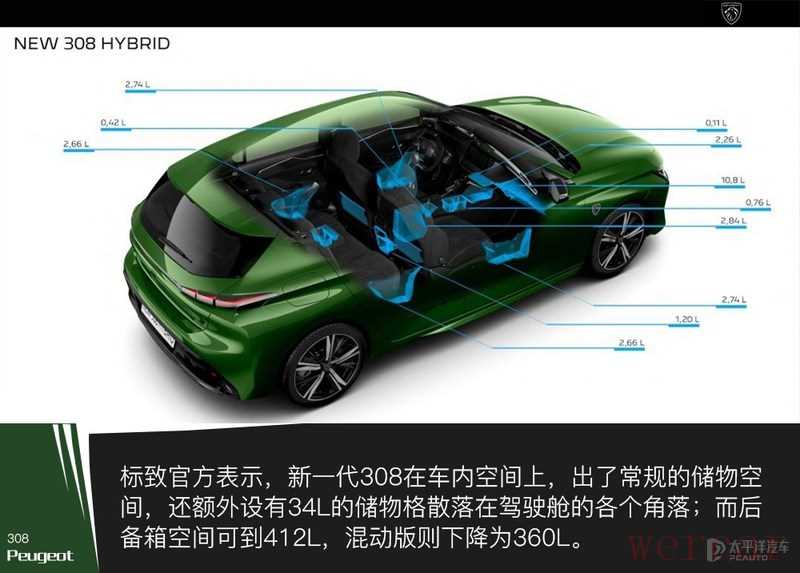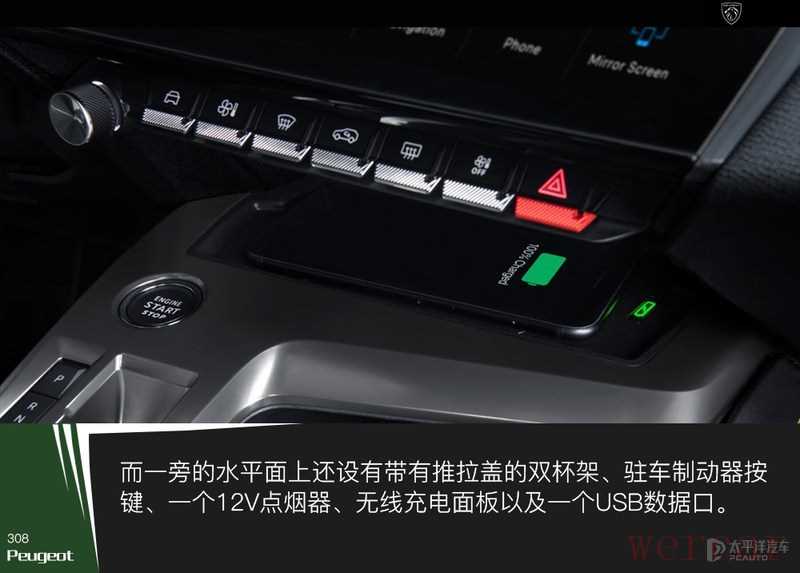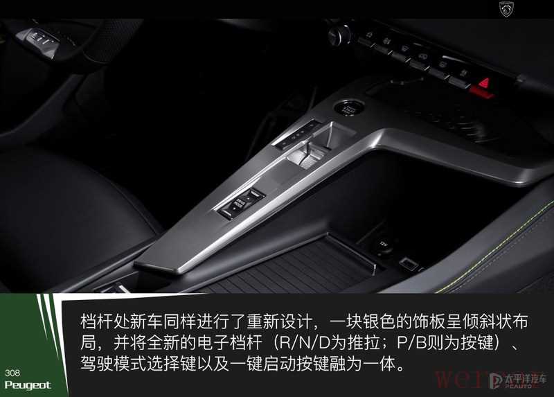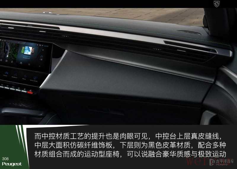新一代标致308的内饰焕然一新,通过设计的力量将豪华与科幻这两个概念发挥到极致并且融合在一起,抬头显示一样的高分辨率液晶仪表带来很强的战斗氛围,中控屏幕向驾驶员偏向的角度非常大。不同寻常的座舱分布,使得驾驶者能够拥有非常独特的驾控感,同时多种材质组合而成高规格运动座椅和丰富的舒适配置又能够带来专属于时尚达人的驾乘体验。
