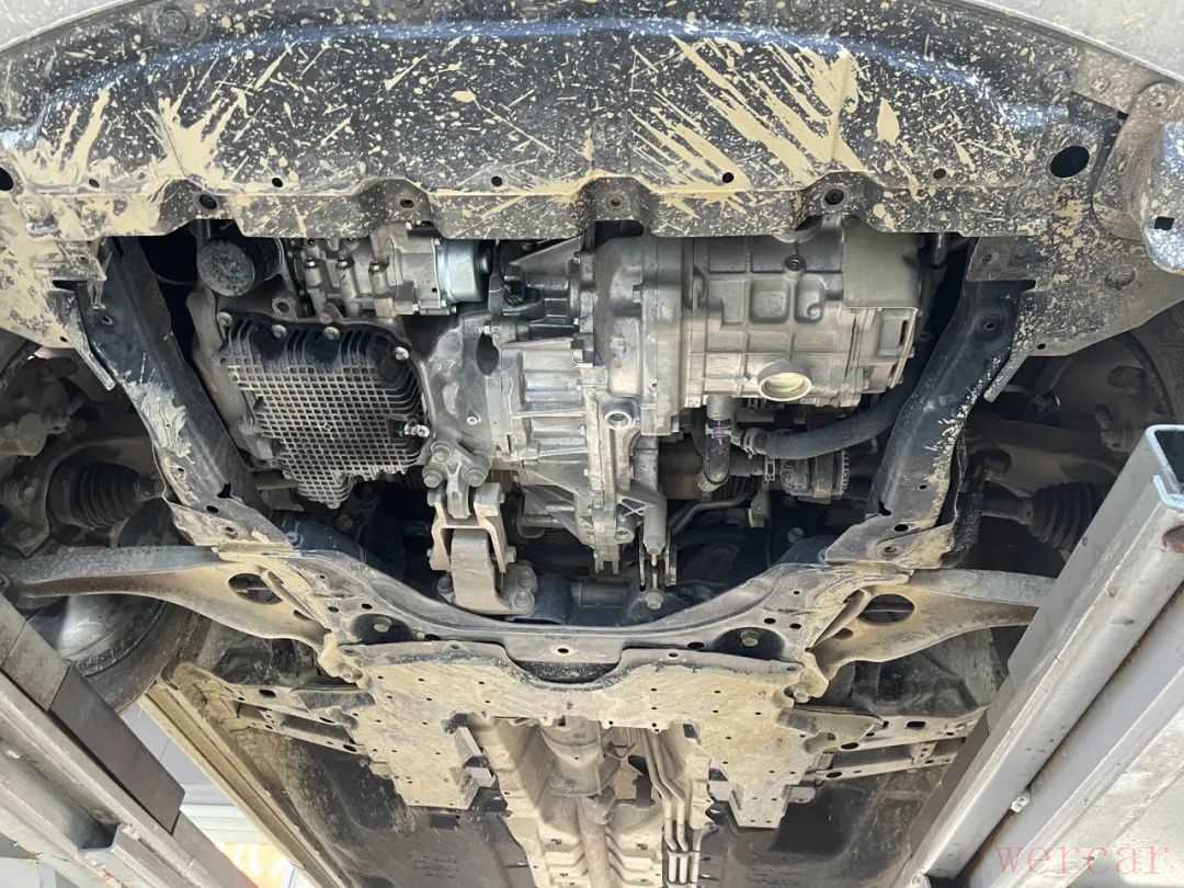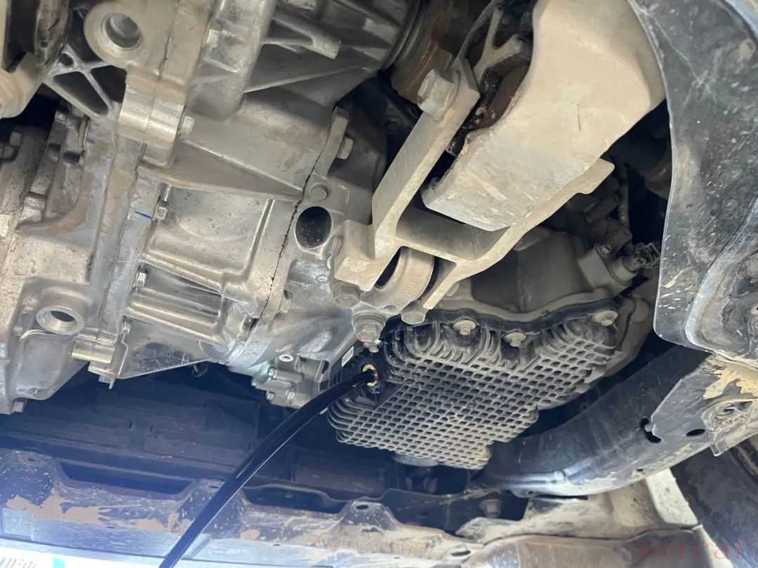 下图所示,可以看到发动机和变速箱的下部较为干净,此时修车师傅又说,没想到发动机的油底壳是塑料材质,好在放油螺丝是金属,密封性比纯塑料的要好不少。