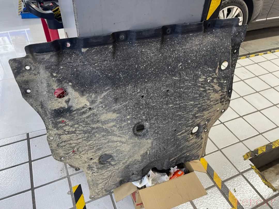 拆下发动机下护板,重量很轻,因为这不是金属材质。这里修车师傅吐槽了一下,护板塑料卡扣真多,一圈都是。
