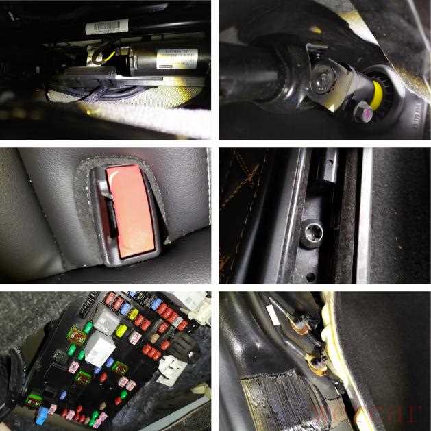 接着我拆掉车内地毯及饰板,开始排查是否存在泡水。座椅及座椅底部线束滑轨、方向机管柱、安全带卡口、座椅螺丝、保险盒及内饰地板等均无拆卸,无水渍泥沙,裸露金属部件也没有生锈痕迹。