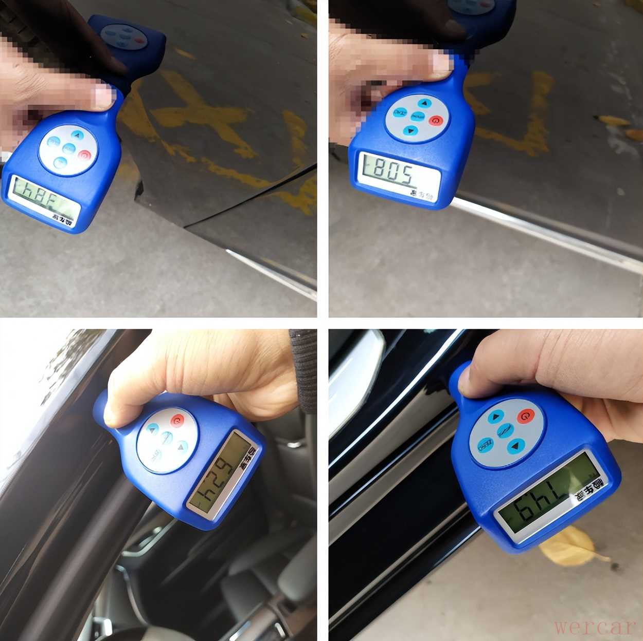 绕车身一周,大致观察一下车身漆面是否存在误差,左右是否对称。一圈下来发现外观有些小剐蹭、漆面小划痕,个别覆盖件存在喷漆,接下来咱们用漆膜仪检测一下漆面。