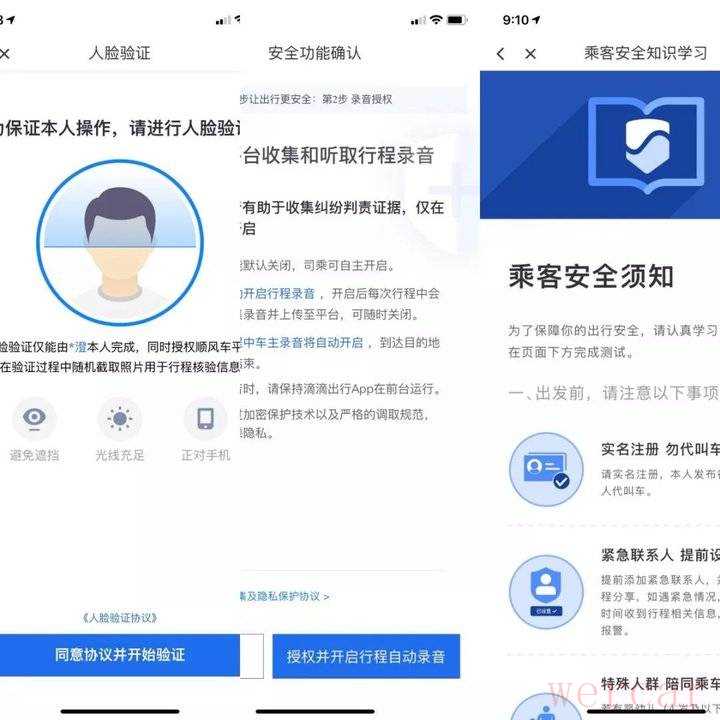 和以前相比,乘客在第一次使用顺风车时,流程略微繁琐。乘客需要完成安全任务,这一任务包括“实名信息认证”、安全功能确认和乘客安全知识学习。其中,实名信息认证需要本人进行人脸识别,同时顺风车平台将在验证过程中随机截取照片进行核验信息;