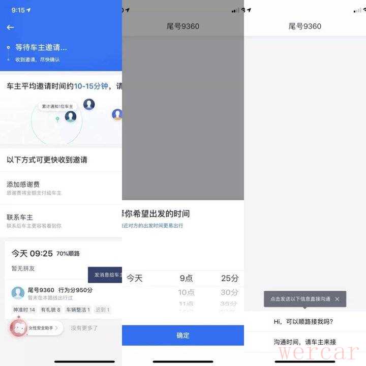 顺风车发单后的界面以及与司机沟通的界面