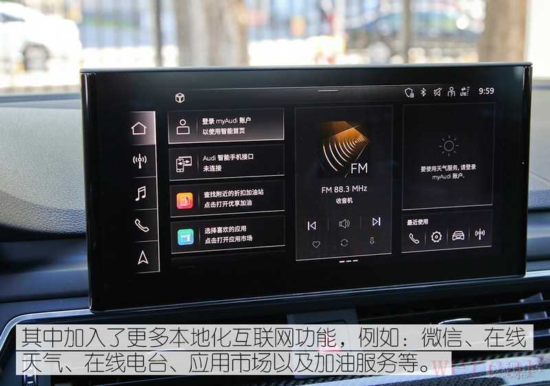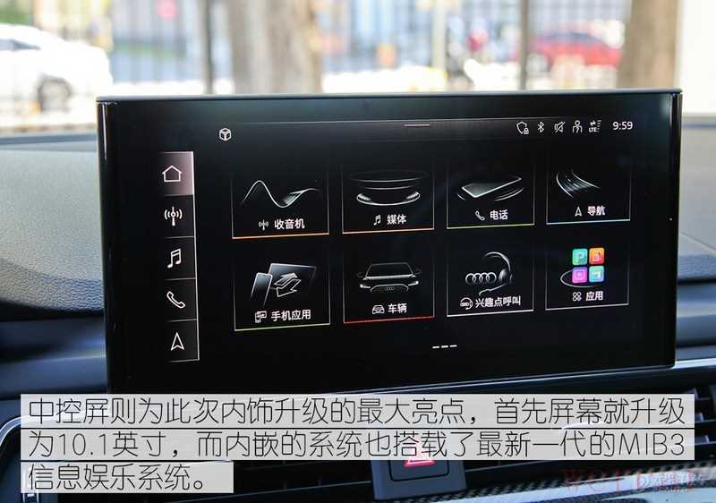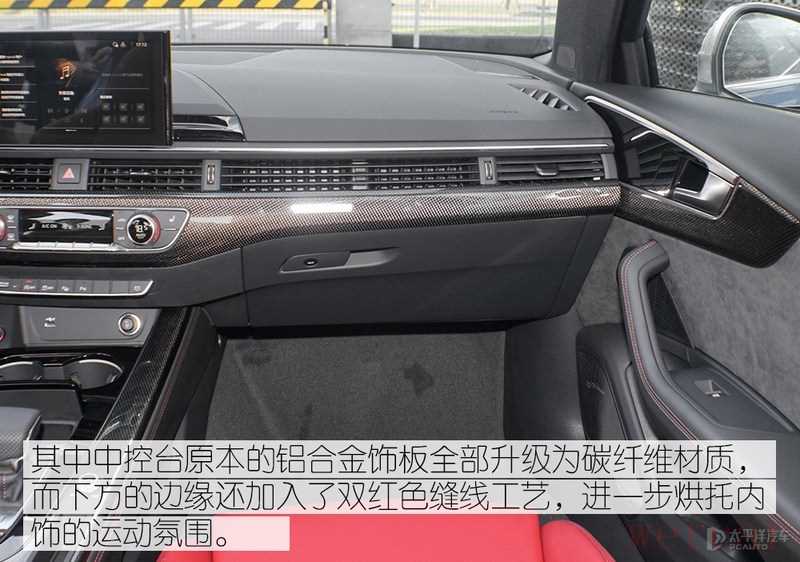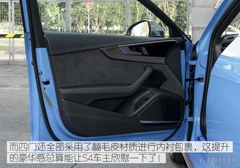 内饰整体设计方面除了换装S系列的方向盘等套件外和A4L级别没有差别,用料上四个门板上都换上了大面的翻毛皮材料触感极佳豪华感很强;而科技配置上还升级了最新一代的MIB3车机系统,除了加入了更多本地化功能外,还额外增加了无线Carplay功能(国产奥迪A4L仅为有线Carplay)。
