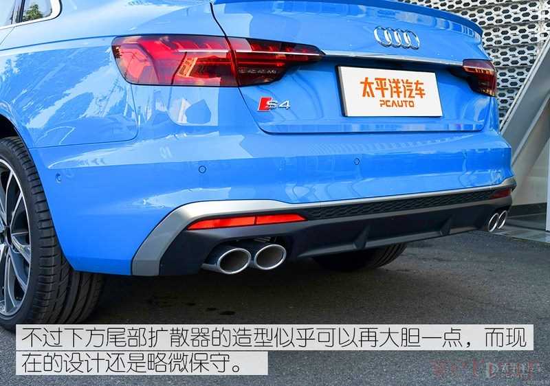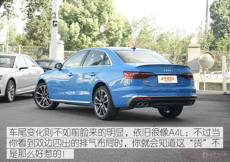 谈到外观,依然是中改之后的新款奥迪S4最大的“痛点”,整个设计与新款奥迪A4LS-Line顶配版本如出一辙,二者都升级了同样的扁平化六边形中网、上条状的进气开口、双五幅轮毂以及全新头尾灯组,但如果非要区别二者,仅能通过中网镀铬细节、S4车型标识、银耳(后视镜盖)、刹车卡钳尺寸以及尾部的排气布局等来判断这是不是一辆奥迪S4。(不过这些区别点,奥迪A4L似乎都能通过某宝件来改)