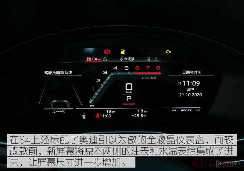值得一提的是,新款奥迪S4的全液晶仪表还加入了源自R8上的S运动模式,直列式转速表随时点燃你的激情。