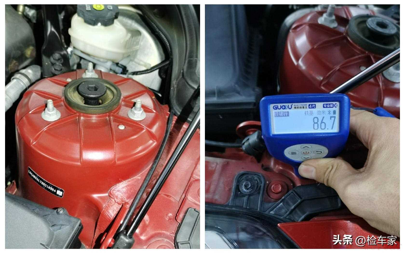 接着检查了两侧的减震座以及翼子板内侧的加强筋,胶线的规则度以及软硬做工是没有问题的,焊点也都在,漆膜仪测量以及目测也没有异常的地方。可以初步排除车辆前部发生过重大事故的可能了。