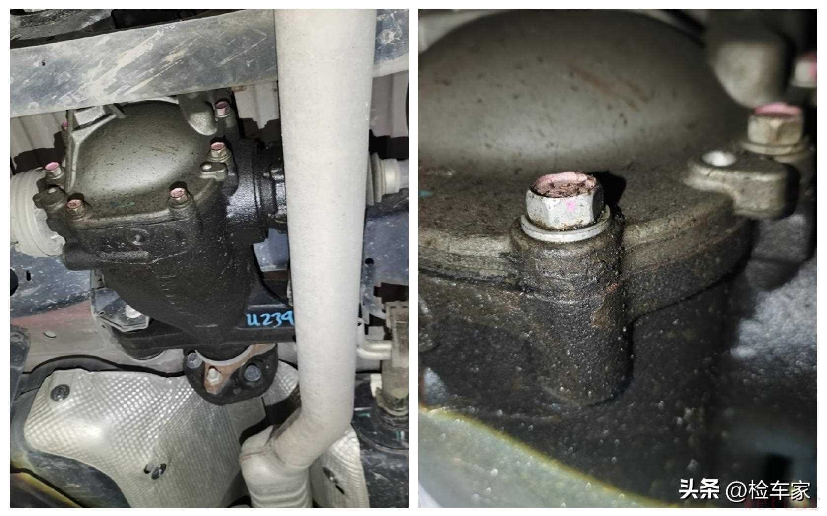 后差速器也存在漏油情况,其实看到这里时大哥就有点不舒服了,还问了一下要处理这些问题的维修情况以及大概费用,看来是有砍价的想法了。但是小鹏我来看,也不一定是差速器壳体本身漏了,也有可能是两边半轴油封漏油。具体情况还需要到修理厂洗一下再重新判断,如果是两边油封漏油就好办了,直接换油封即可。