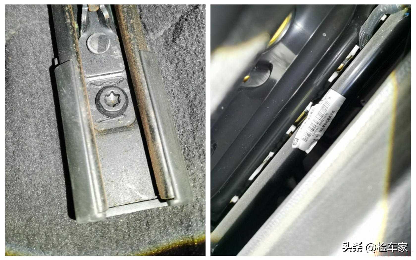 内饰座椅没有拆装痕迹,从底部金属部件来看,没有发现异常。有斑点锈迹什么的也是正常情况,像洗车偶尔也会带进来一些水渍。