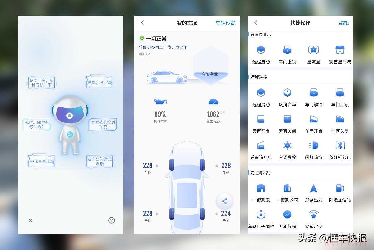 早上出门前,可以提前通过手机查看车辆状态,能看到的信息还是挺丰富的,包括停车位置、油量、续航里程、胎压和保养周期, 还可以说出“你好,小O“唤醒语音助手来播报车况。