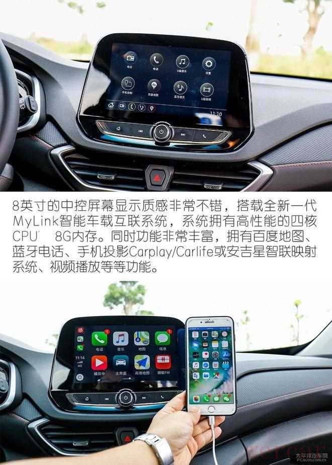 8英寸的中控屏幕显示质感非常不错,搭载全新一代MyLink智能车载互联系统,系统拥有高性能的四核CPU 8G内存。同时功能非常丰富,拥有百度地图、蓝牙电话、手机投影CarplayCarlife或安吉星智联映射系统、视频播放等等功能。