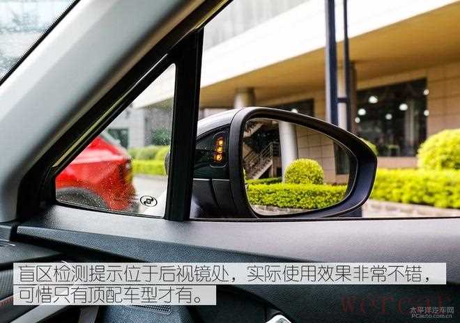 盲区监测提示位于后视镜外,实际使用效果非常不错,可惜只有顶配车型才有。