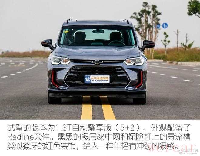 试驾的版本为1.3T自动耀享版(5+2),外观配备了Redline套件。熏黑的多层次中网和保险杠上的导流槽类似獠牙的红色装饰,给人一种年轻有冲劲凶狠感。