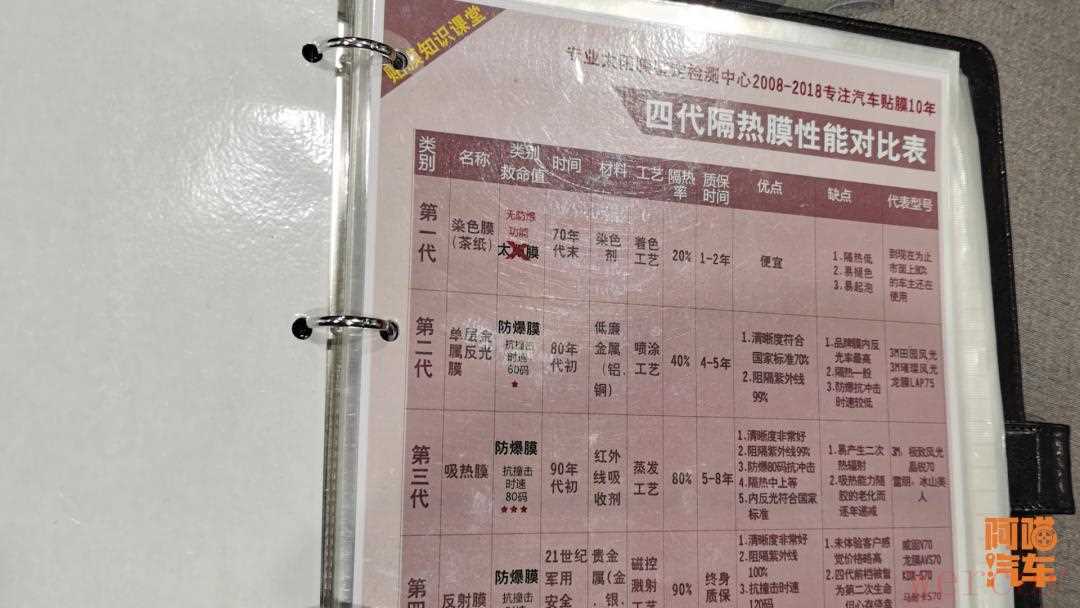 如果坚持不要收费的项目,只要免费贴膜的,反正喵哥这次看到的,他会让你看了10分钟资料,再给你贴膜,都是什么资料呢?大家可以看一下,这是喵哥当时拍的,基本上所有的资料里面,都在指向的就是送的贴膜是染色膜,不具备防防爆功能,是最差的膜,透光率又低,反正就各种各样的,把所有的膜说的一无是,全是垃圾。