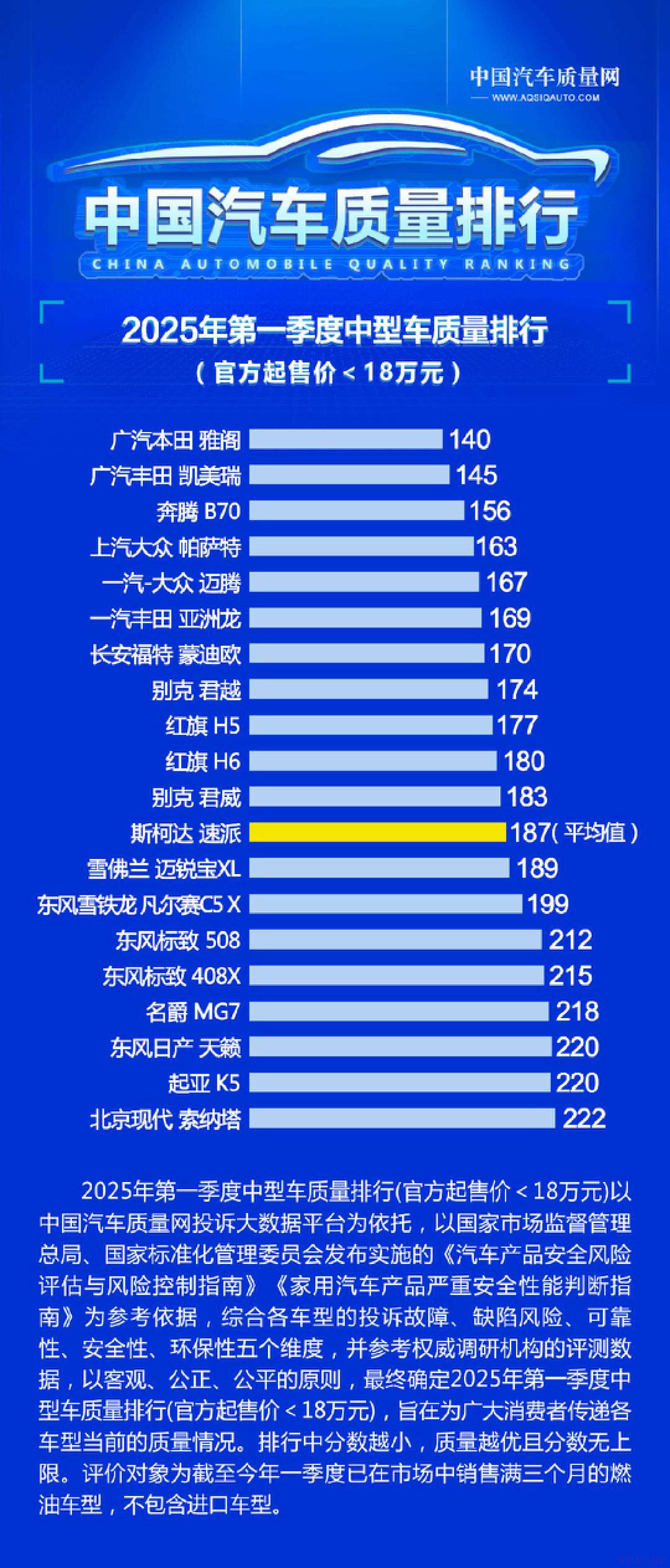 5月8日,据中国汽车质量网发布的2025年第一季度中型车质量排行榜(官方起售价<18万元)显示,共有20款热门车型参与排名。