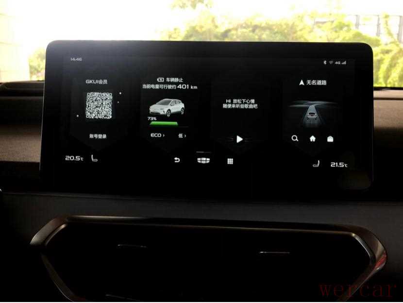 空调的控制区域保留了原始的物理按键,这一波操作很“奈斯”!E-touch中央超感控制区,通过触摸的方式就可以将各个功能激活或者关闭。之前几何A上出现的功能标识反光的问题,如今在几何C上已经完美解决了。实不实用放一边儿,但这种操作感觉确实挺新潮的,有机会你也可以亲自试一试!电子旋钮式换挡,扭动阻尼手感不赖,像我这种强迫症患者已经被成功征服了。