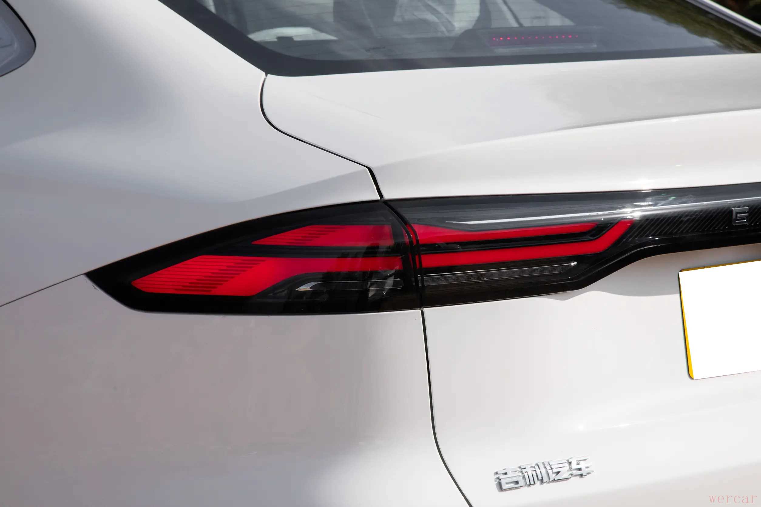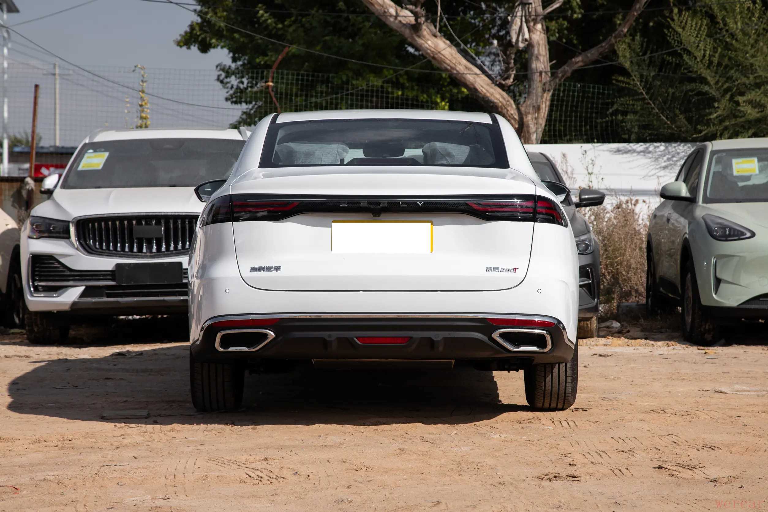 全新帝豪的尾灯点亮后会呈现出上下两层红色光带,灯组之间由带有“GEELY”字母标识的黑色饰板相连,形成了贯穿的样式,实拍车型为1.5T版本,尾门右侧有“帝豪290T”标识,配有带扩散器样式的后包围以及双边两出镀铬装饰口。