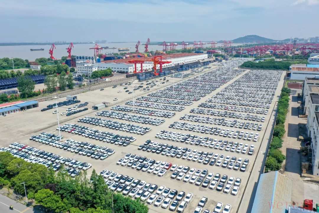 一排排崭新的汽车在芜湖港整装待发。陈剑/摄