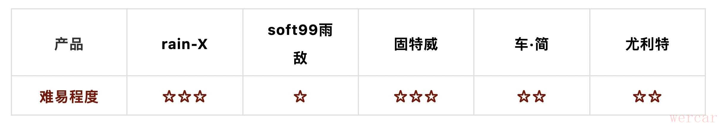 soft99雨敌挡风玻璃防雨剂为日本进口产品。固特威树脂挡风玻璃防雨剂为国产老牌。车·简全玻璃防雨剂是全网单瓶装最便宜的。尤利特玻璃防雨剂是全网销量最多的。「施工难度测试」