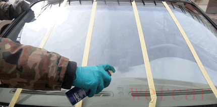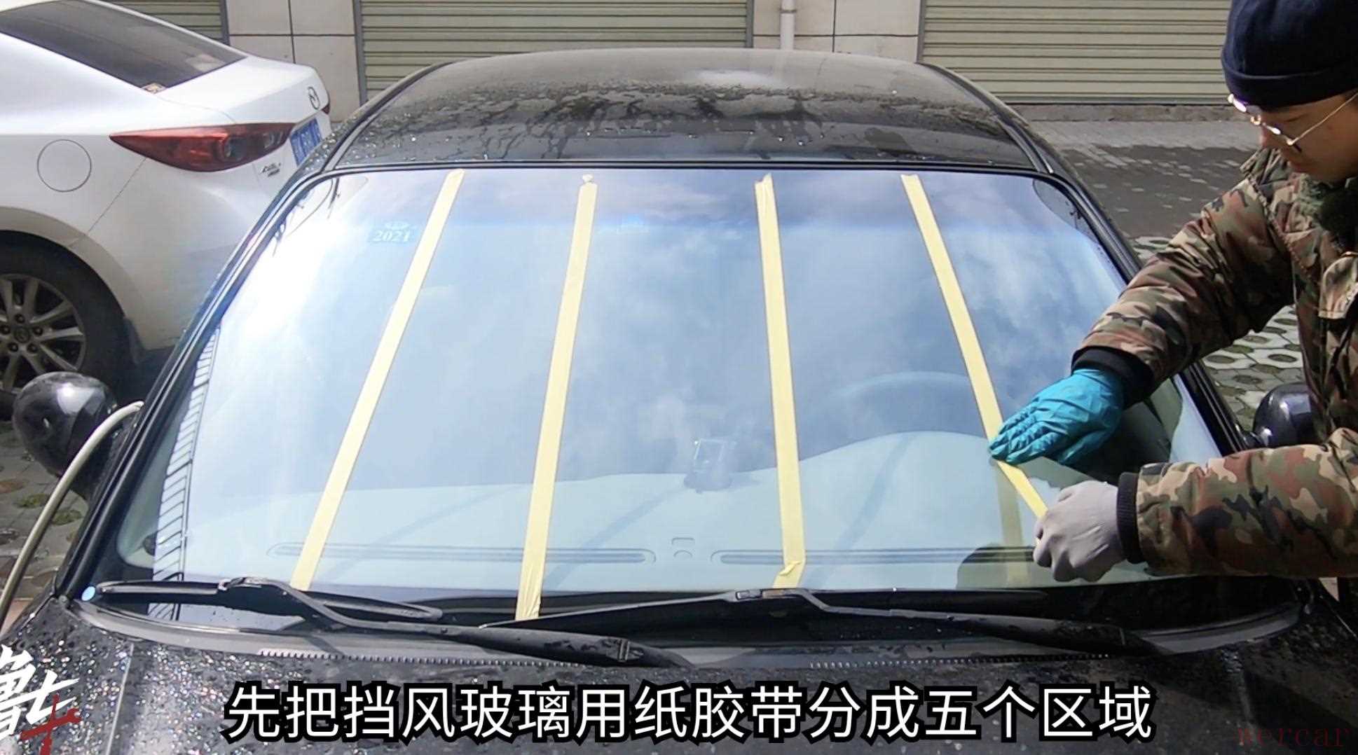 所以我用专用的玻璃清洁剂把玻璃彻底清洗干净后,用纸胶带把挡风玻璃分成了5个区域,然后在上面分别施工5款产品。并且为了测试的严谨度,每款防雨剂我都单独准备了两块干净的毛巾,避免它们出现交叉影响。rain-X: