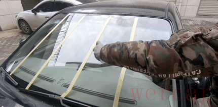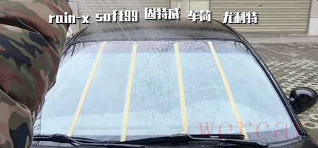 所以我特地把车窗玻璃用纸胶带分成了6块,随机选择了soft99雨敌和固特威防雨剂,然后用上面3种错误的操作施工,看看雨刷跳动和异响的是如何产生的。