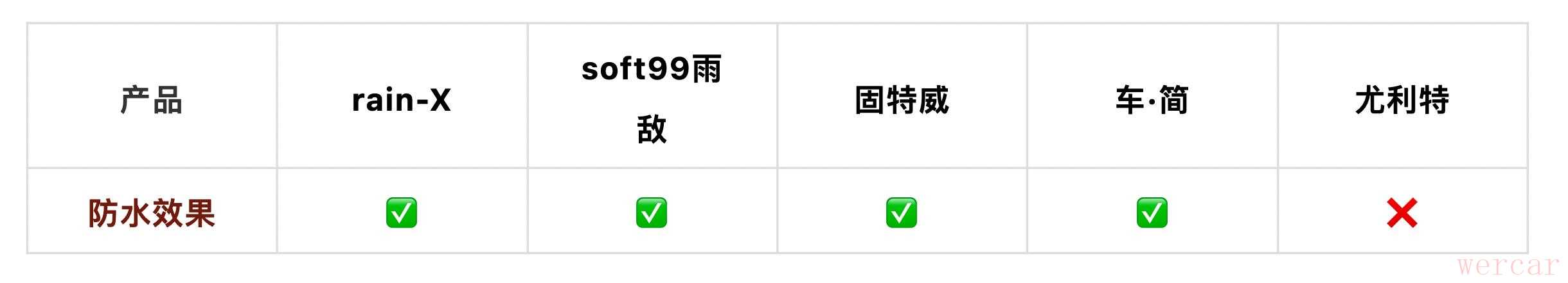 车·简只能勉强扛住洗车泡沫这一关,如果用玻璃油膜去除剂或者柏油清洗剂清洗,那防雨效果分分钟消失。持久力最差的是尤利特,洗车泡沫这一关都过不了,更不谈玻璃油膜去除剂和柏油清洗剂了。最后我还做了一个小测试:我研究了一下,用了玻璃防雨剂后造成雨刷异响跳动、玻璃泛白的主要原因有以下3个。1、玻璃本身没有清洁干净,就直接用了防雨剂。2、防雨剂喷在玻璃上后,干燥的时间过长。3、防雨剂干燥后没有把防雨剂完全擦拭干净。