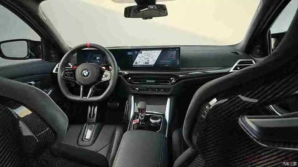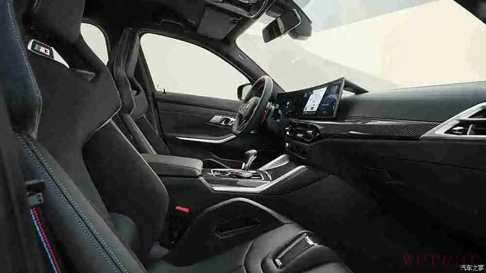 新款M3换装了全新设计的平底方向盘,并拥有红色回正标设计,进一步增添战斗氛围。空调出风口的设计进行了微调,从银色变为黑色,内饰其他部分和现款保持一致,配备了12.3英寸的全液晶仪表盘和14.9英寸的中控大屏,搭载BMW Operating System 8.5车机系统。