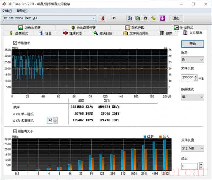 使用HD Tune进行200GB连续写入测试,没有出现掉速情况。