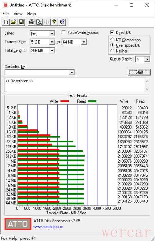 ATTO Benchmark的峰值读写成绩甚至达到了3349MB/s和2100MB/s,达到了官方标称值。