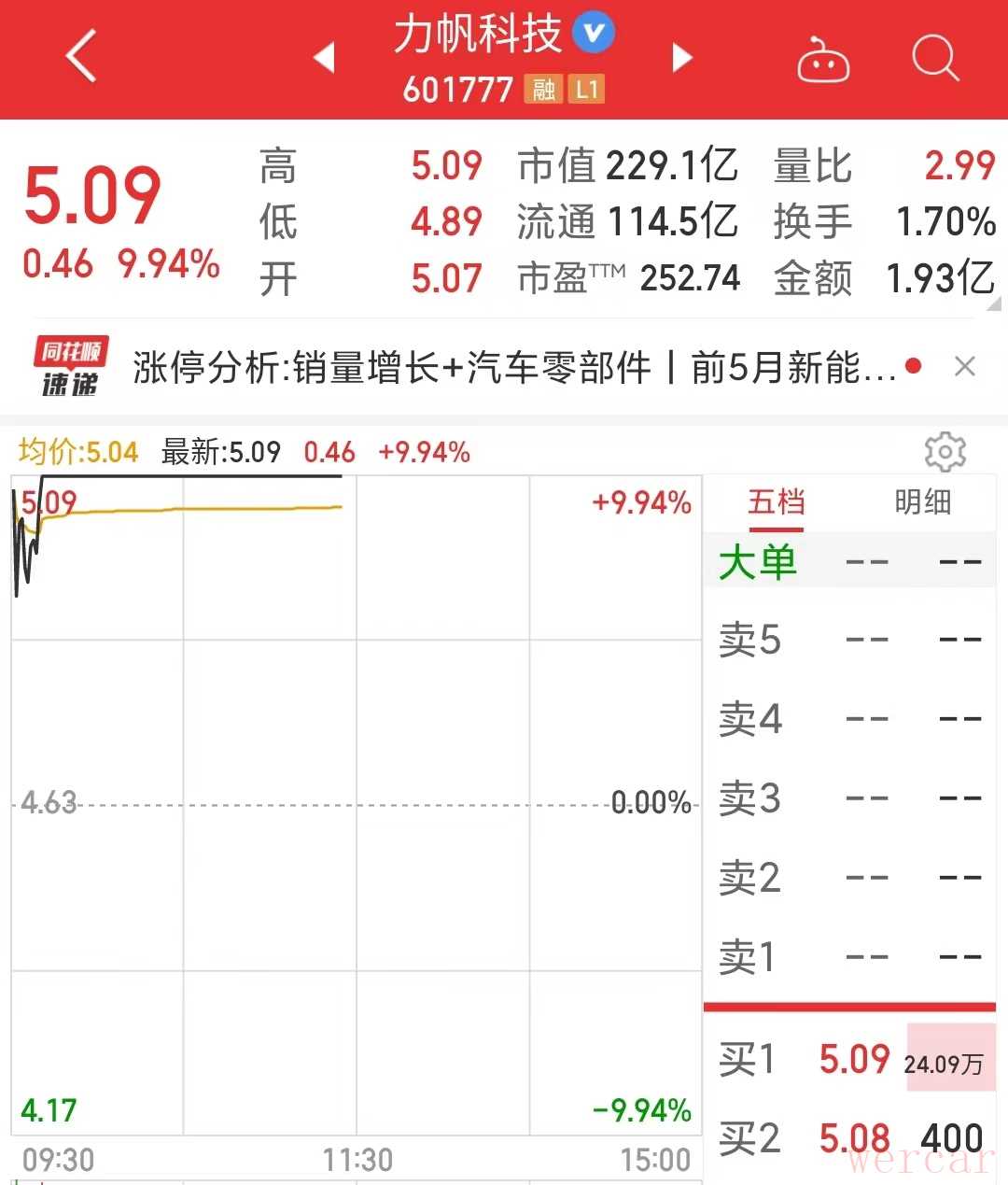 6月8日,力帆科技(601777.SH)迎来年内第三次涨停。同花顺数据显示,股市开盘半小时,力帆科技股价涨9.94%触及涨停,报5.09元/股,总市值达229.1亿元。二级资本市场的强劲表现背后,离不开其交出的亮眼成绩单。