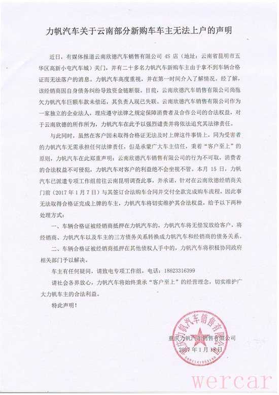 今年1月份,就有消息称力帆汽车云南昆明一家4S店人去楼空,导致二十多名车主付了车款却因为拿不到车辆合格证无法落户上牌。原来,该家4S店“因自身债务纠纷导致资金链断裂”,将合格证抵押银行而取得资金,结果直接导致了拖延合格证、车主新车无法上牌。