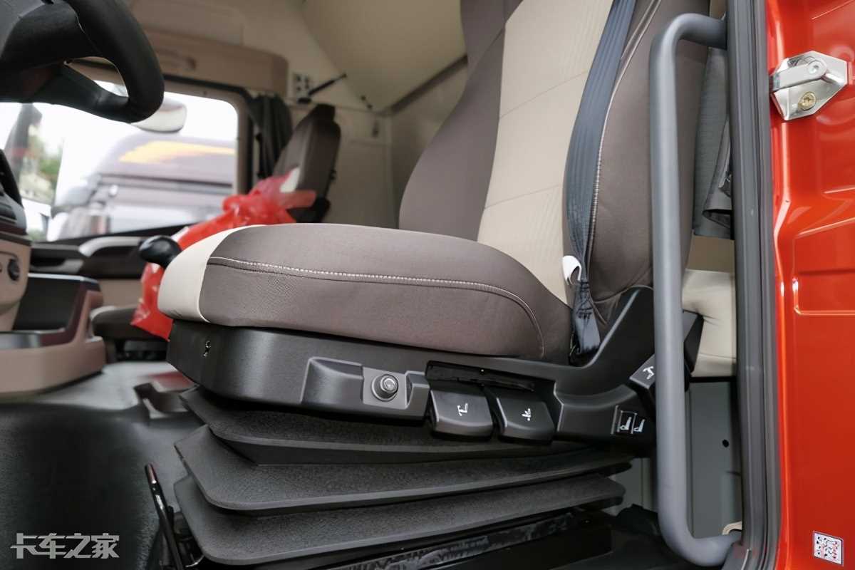 在驾驶舱的设计上,介绍的这款解放青汽JH6采用高顶双卧凸地板驾驶室,为两人排半设计。在舒适性上,除了标配的驾驶室四点气囊悬置,主驾配置了多项调节气囊减震座椅,符合人机工程学设计,具备通风加热的功能。