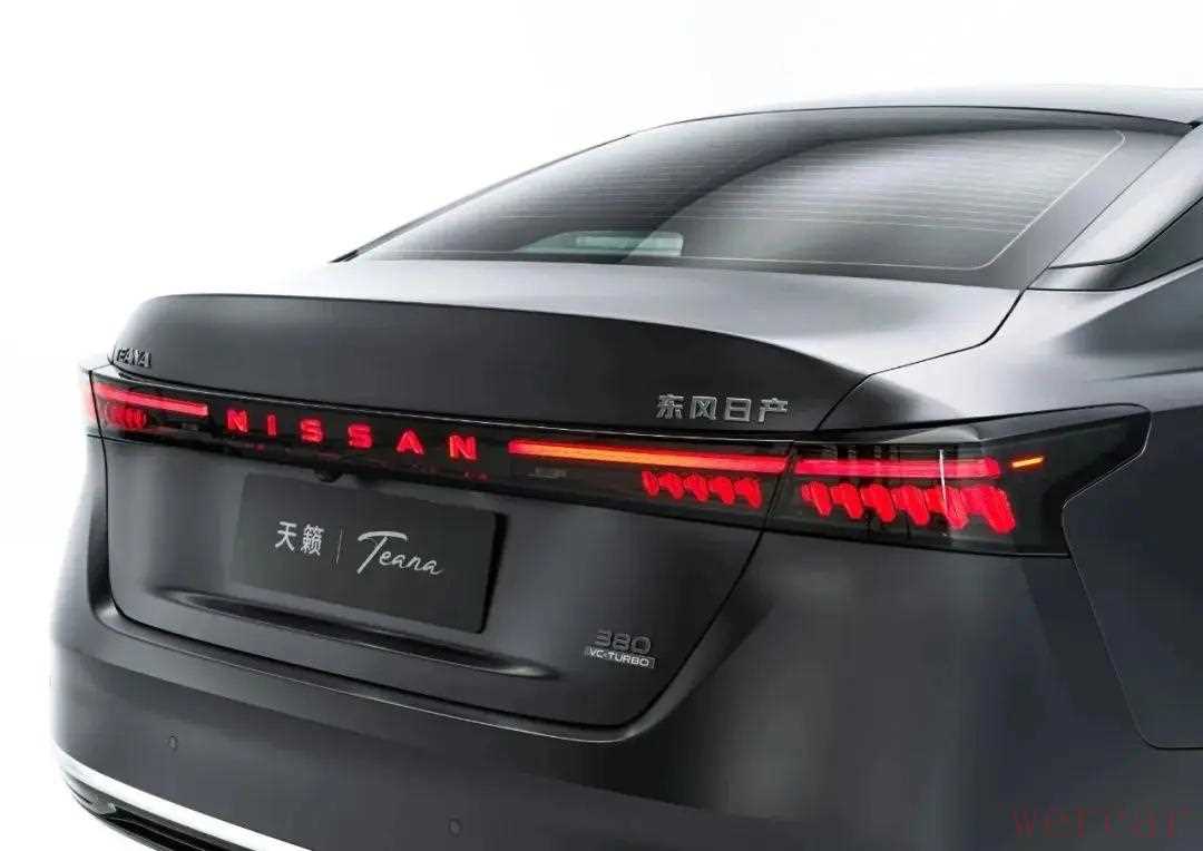 侧面造型更加修长优雅。值得注意的是,与早期一些传闻不同,新款天籁并未采用时下流行的隐藏式门把手,而是保留了传统的外露式设计。车尾部分,贯穿式尾灯设计成为亮点,尾灯中心是NISSAN的标识,两侧镶嵌11枚宝石灯体。后包围采用整体性更强的设计,新增的哑光灰车色进一步提升了整车质感。