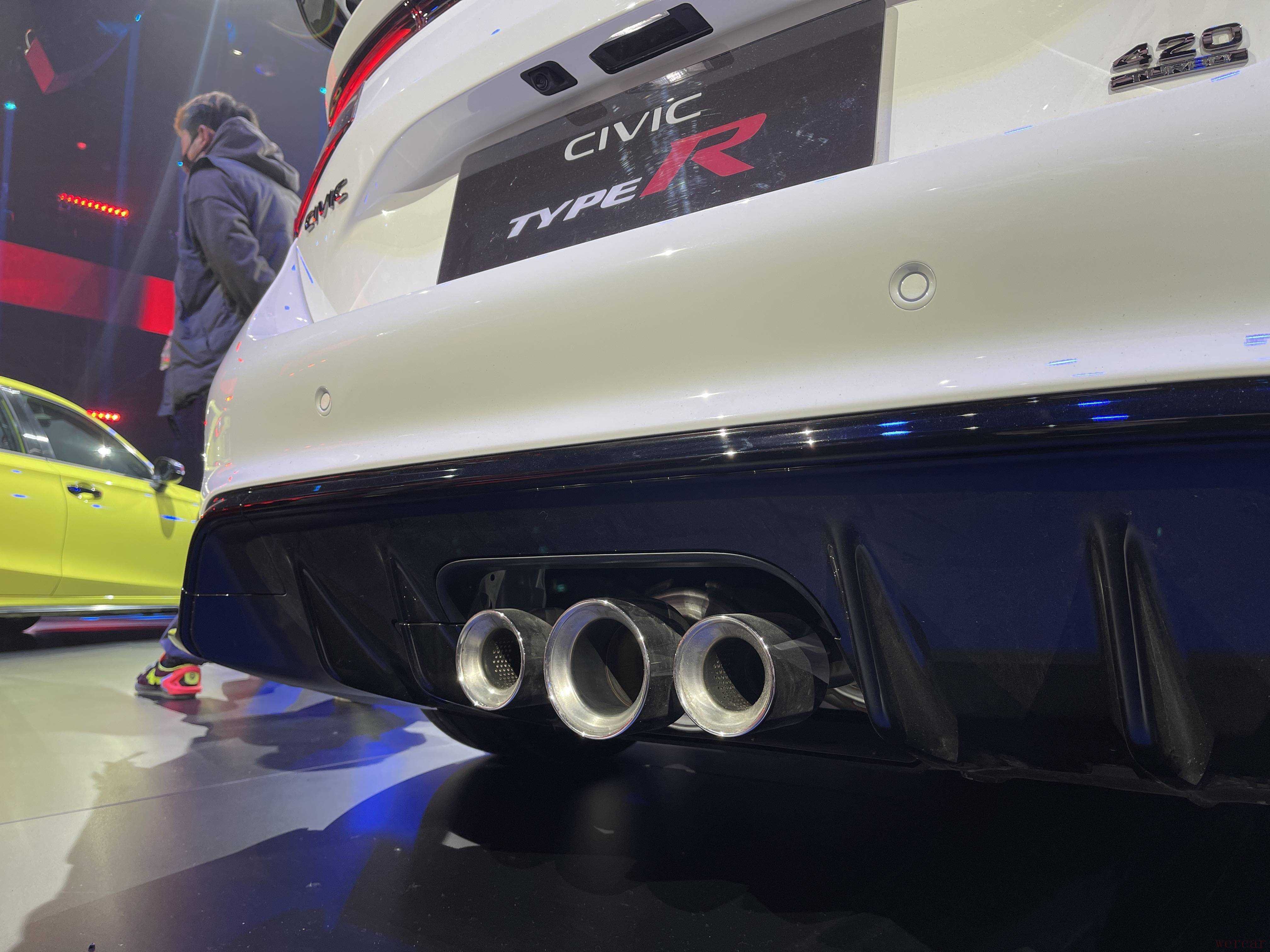 车身侧面,全新本田思域TYPE R造型相对简洁,采用了黑色的后视镜和轮毂,没有了上一代车型夸张的空气动力包围,刹车则采用了红色的Brembo刹车卡钳。车尾部分,尾翼的尺寸与款式都更为“低调”,倒是标志性的中置三出式排气,还能唬唬人。