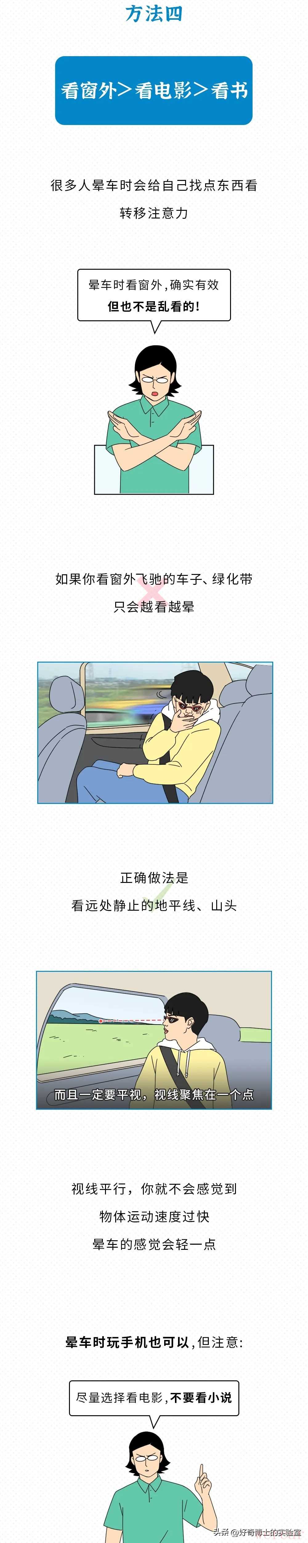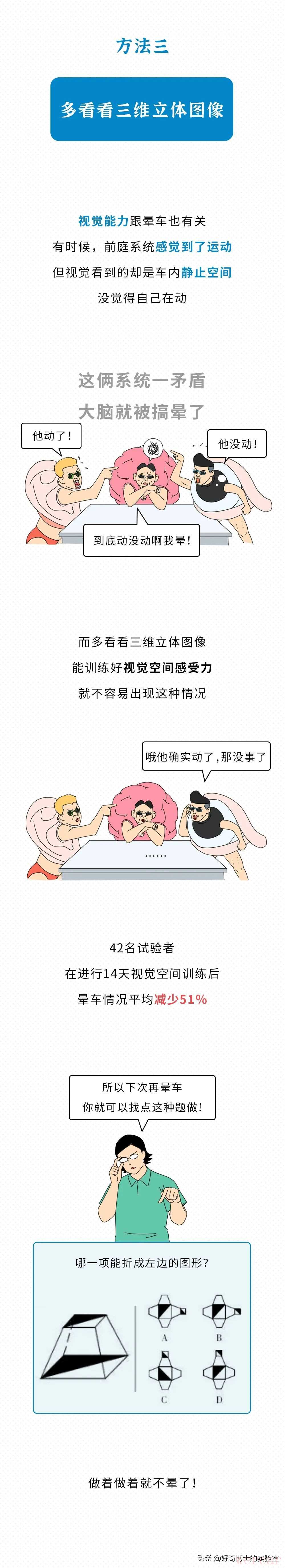 方法三:多看看三维立体图像。视觉能力跟晕车也有关,有时候,前庭系统感觉到了运动,但视觉看到的却是车内静止的空间,这俩系统一矛盾,大脑就被搞晕了。而多看看三维立体图像,能训练好视觉空间的感受力,就不容易出现这种情况。