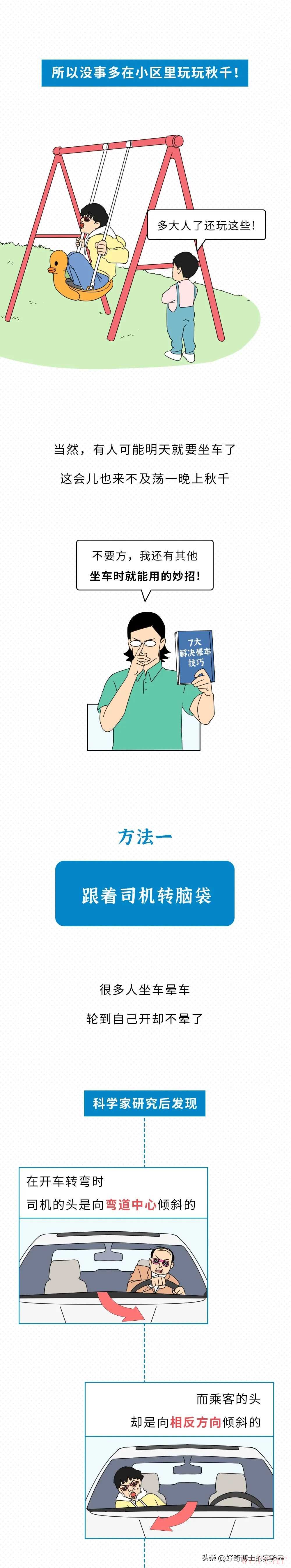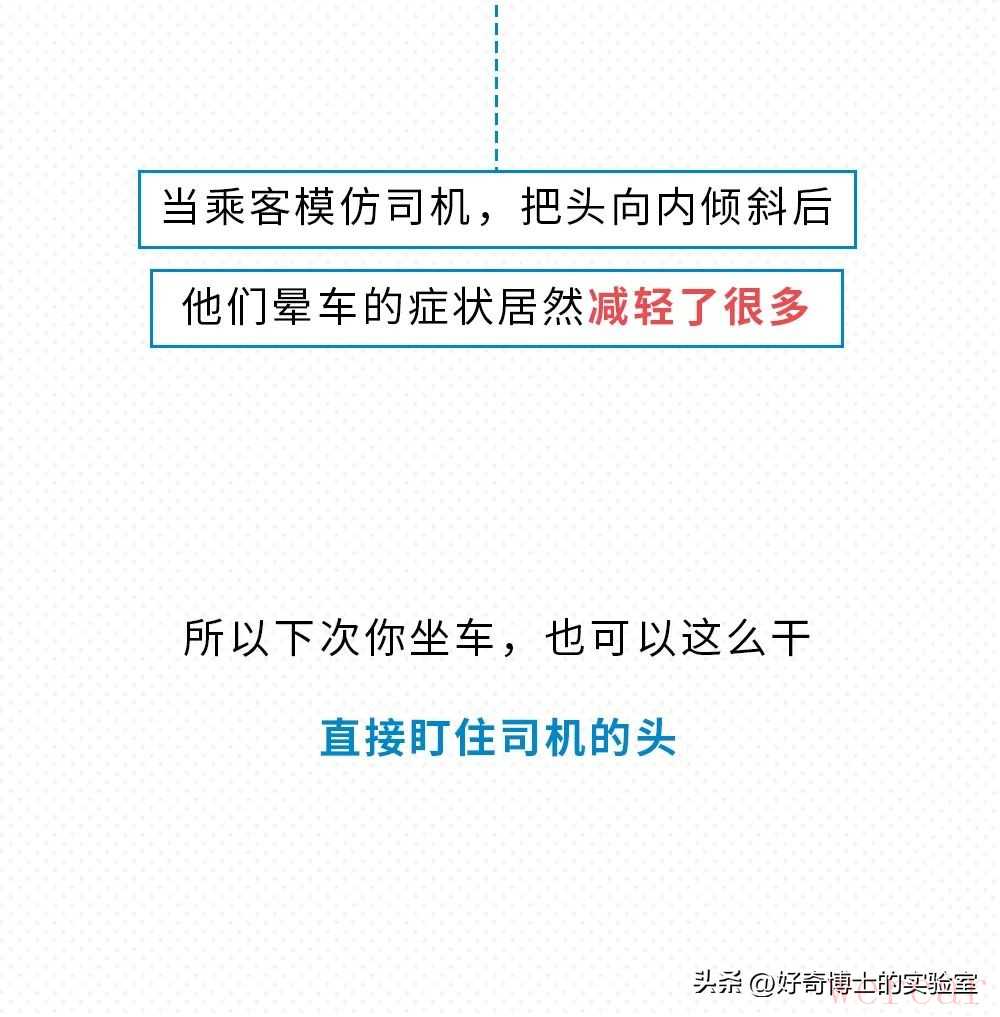 方法一:跟着司机转脑袋。有研究发现,在开车转弯时,司机的头是向弯道中心倾斜的,而乘客的头却是向相反方向倾斜的,当乘客模仿司机,把头向同方向倾斜后,他们的晕车症状就会减轻很多。
