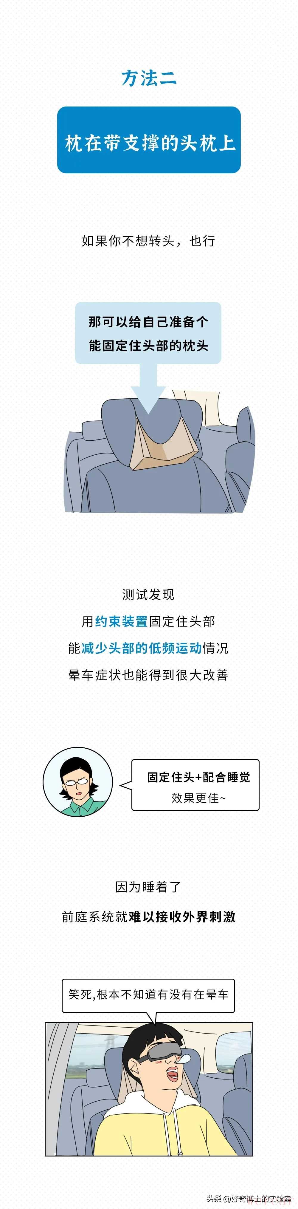 方法二:枕在有支撑的头枕上。测试发现,用约束装置固定住头部,能减少头部的低频运动情况,晕车症状也能得到很大改善。固定头部+配合睡觉效果更佳,因为睡着了,前庭系统就难以接受外界刺激。