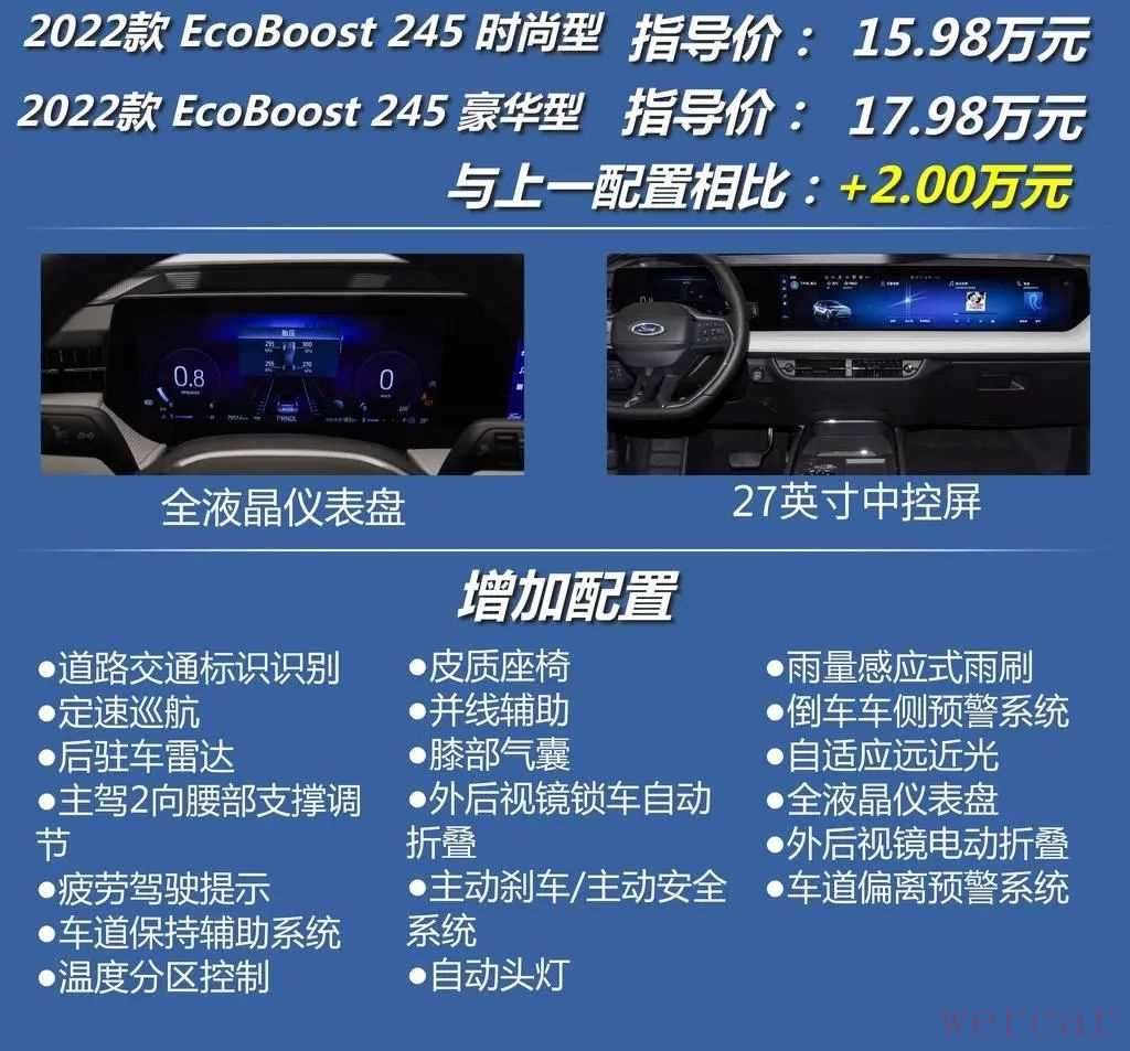 其次推荐2022款 EcoBoost 245 豪华型,它的配置也很丰富,主动刹车/主动安全系统的出现可以提升行车的安全性,而27英寸中控屏则极大的提升了内饰的科技感,非常符合年轻消费者的需求。