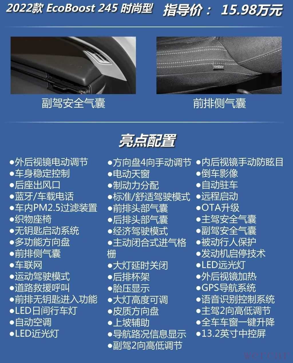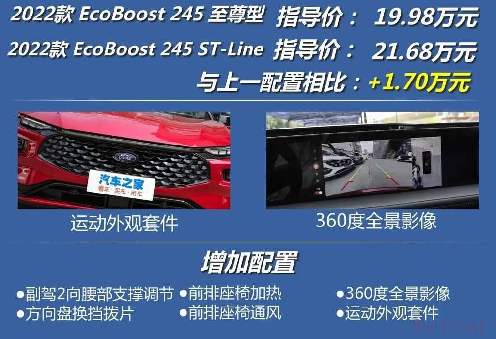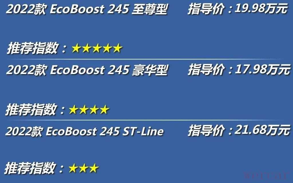 首先要推荐2022款 EcoBoost 245 至尊型,作为全系的次顶配车型它的配置十分丰富,像增加的全速域自适应巡航和B&O音响,能给你的日常用车体验带来极大的提升。