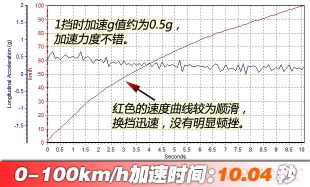 在加速测试过程中,一挡的加速势头挺猛的,最终0-100km/h加速测得成绩10.04秒。对于同级车型来说,这样的成绩值得肯定,这样的动力水平对于日常代步来说很足够了。