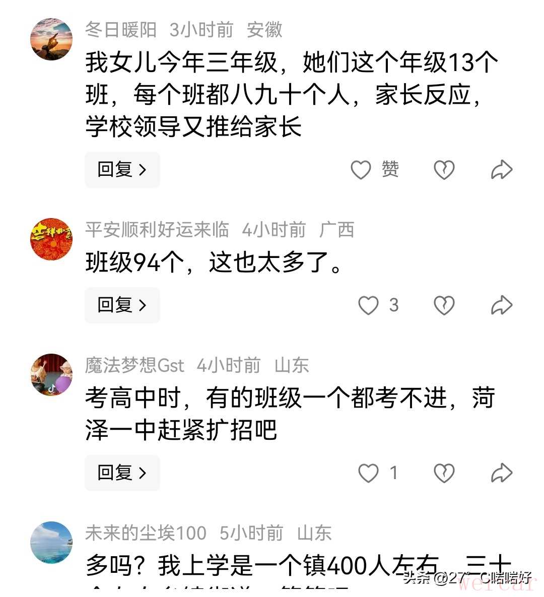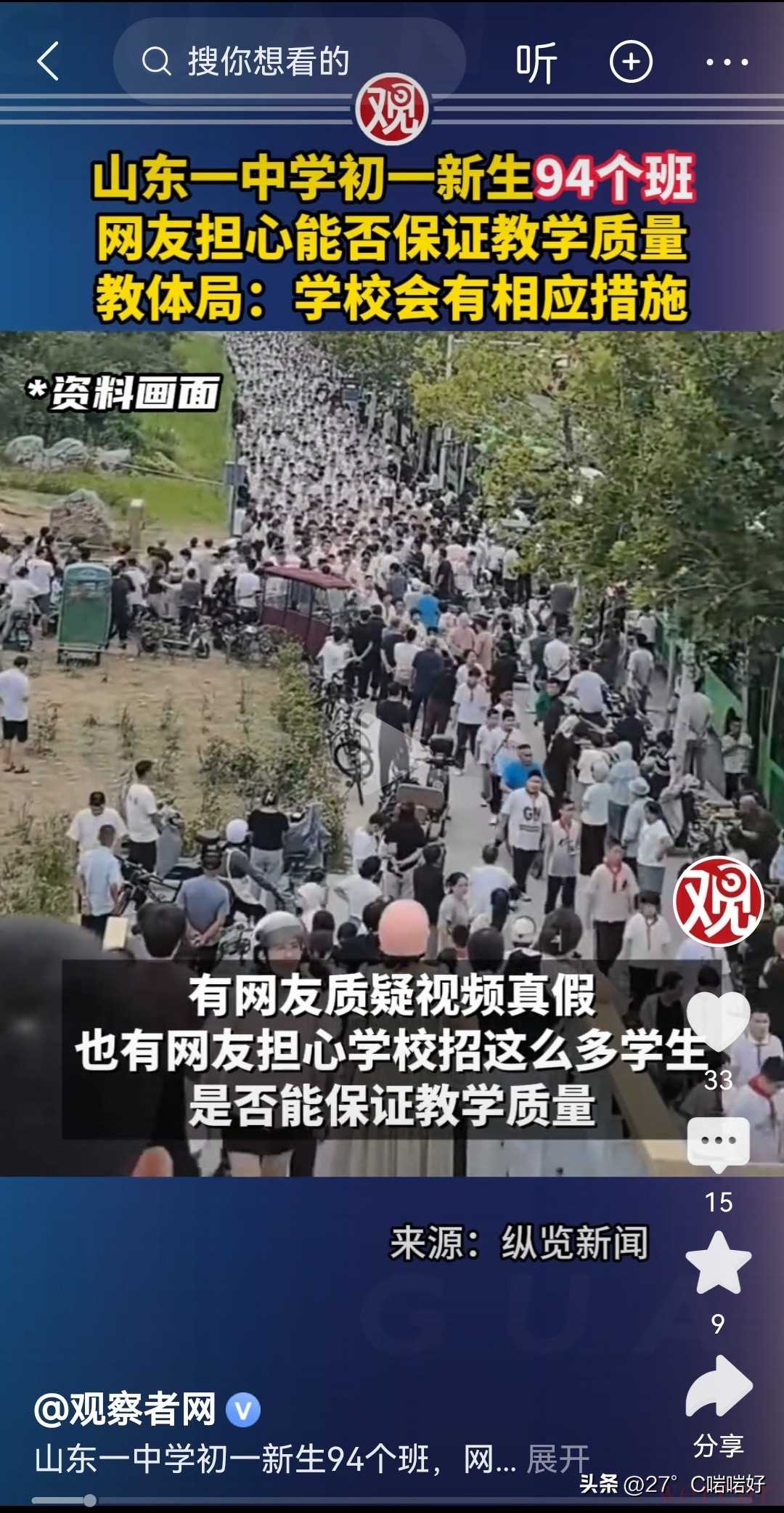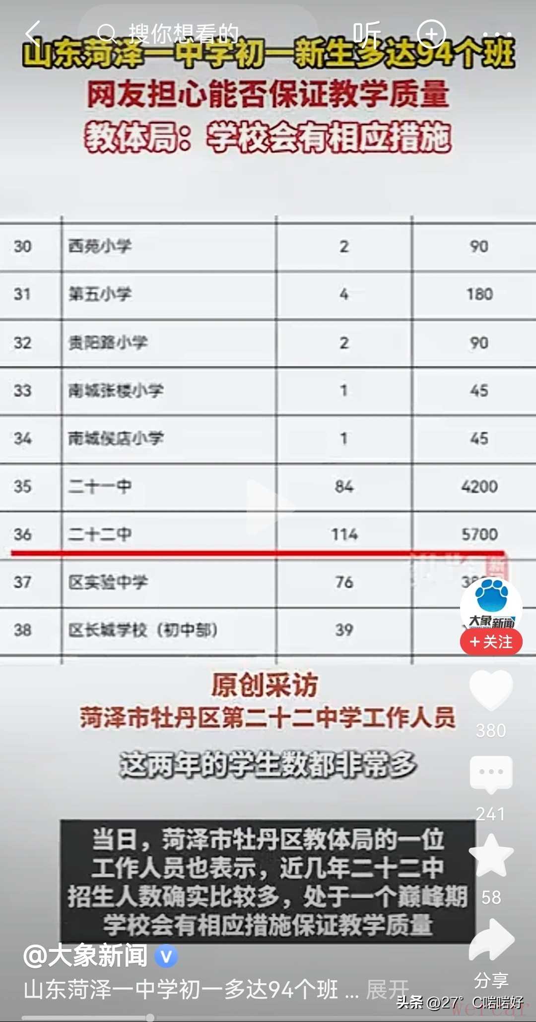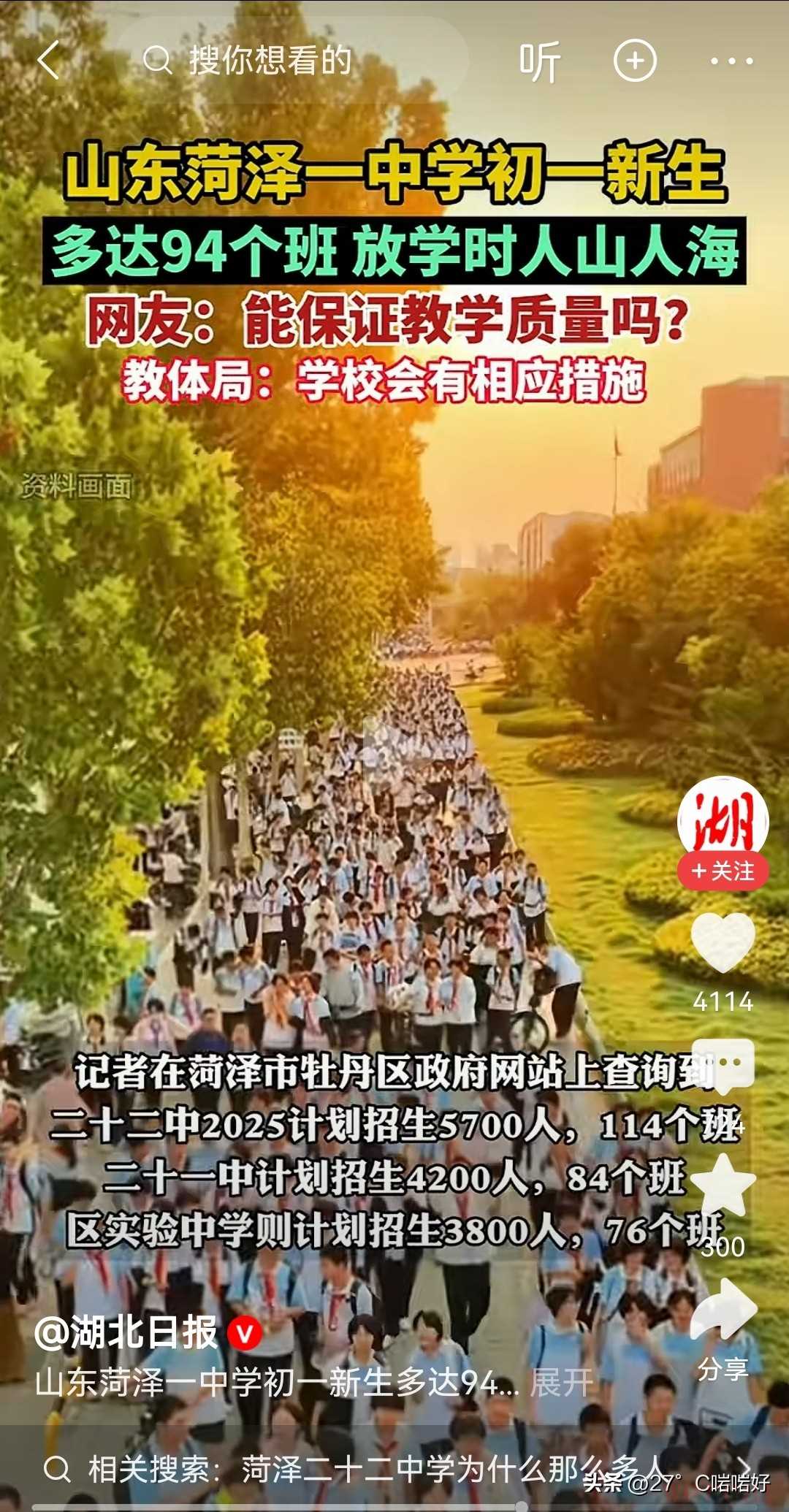 ▷对此, 你又是怎么看的呢?欢迎在评论区留言讨论。#在记录我的2025##教体局回应一中学新初一共94个班# #山东一中学初一新生多达94个班# #一初中初一新生多达94班##山东菏泽#