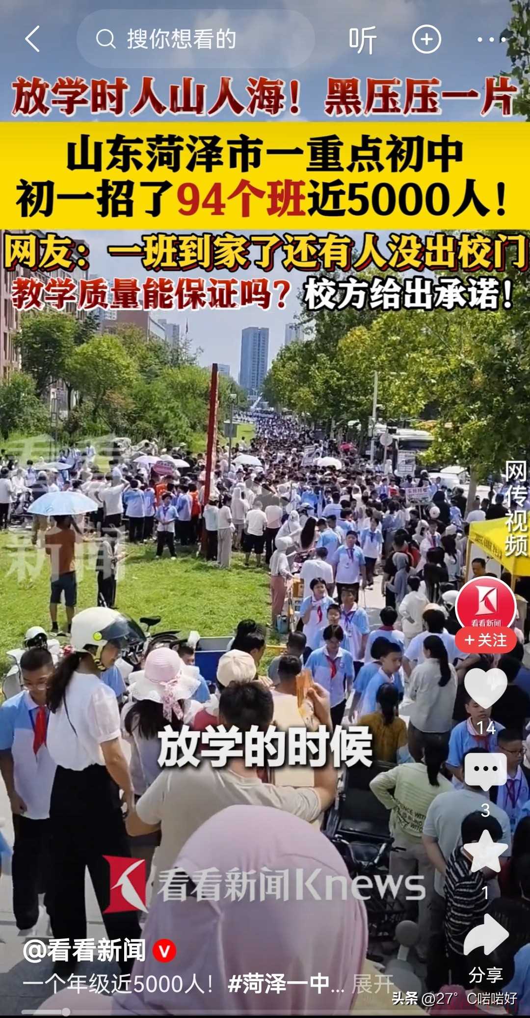 ▷近日,综合大象新闻、看看新闻及湖北日报等消息,在山东菏泽,有网友爆料当地牡丹区的一个中学,今年秋季初一竟然开了94个班,放学的时候造成校门口交通瘫痪,乌泱泱的一片,学生数量多的看不到尽头,引发了大量的关注和讨论,在热门话题中刷屏不断。据悉,招生94个班的是菏泽二十二中学,计划招生是114个班5700人,另外一个“巨无霸”级生的学校是菏泽二十一中学,计划招生84个班 2400人。对此,有人吐槽,一边是各种招式去催生,另外一边又是学校招生爆棚!