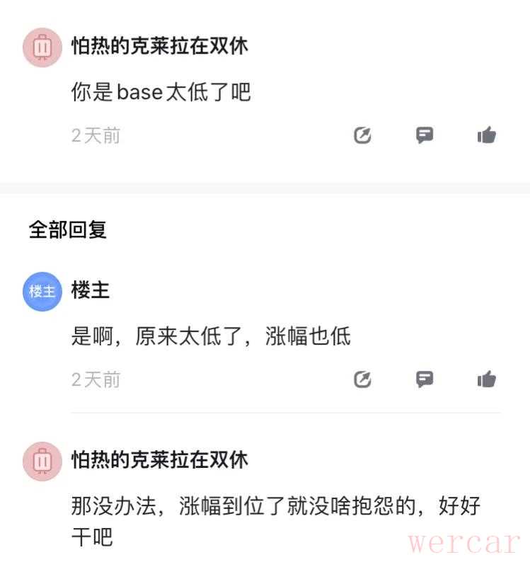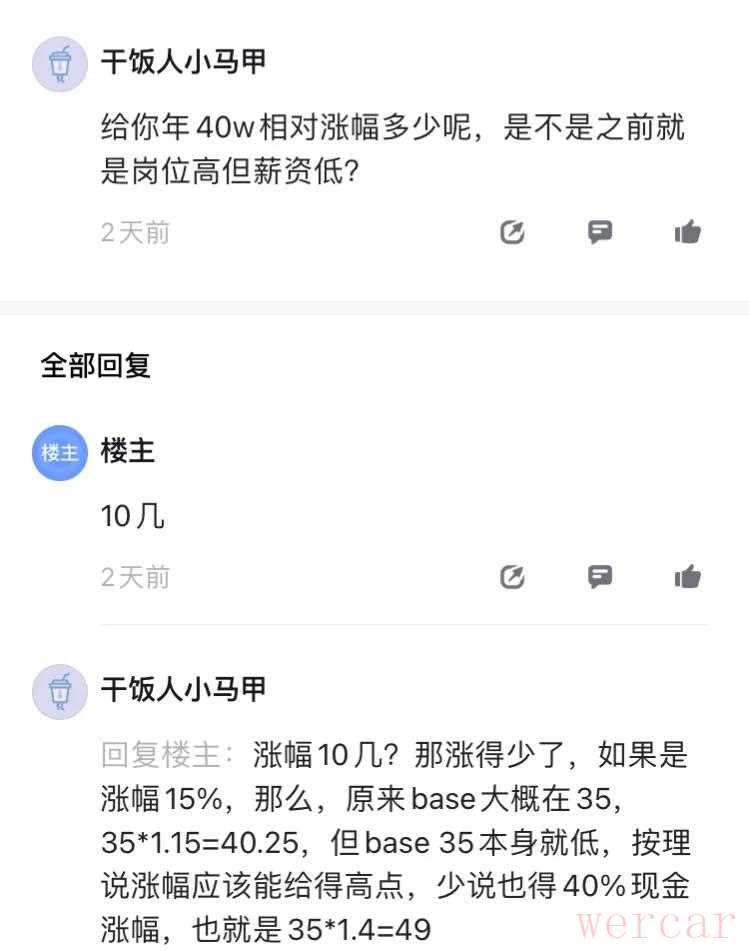 该网友表示,回复楼主:涨幅10几?那涨得少了,如果是涨幅15%,那么,原来base大概在35,35*1.15=40.25,但base 35本身就低,按理说涨幅应该能给得高点,少说也得40%现金涨幅,也就是35*1.4=49