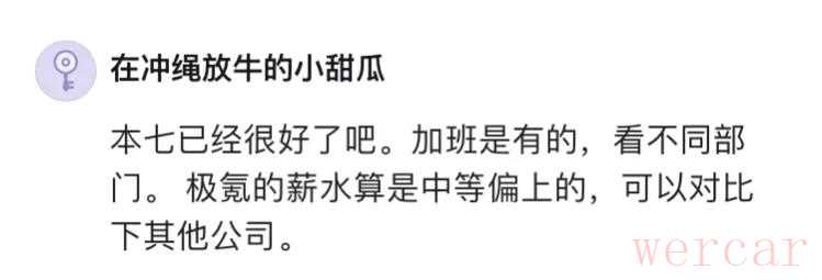 有网友回复说,本七已经很好了吧。加班是有的,看不同部门。 极氪的薪水算是中等偏上的,可以对比下其他公司。