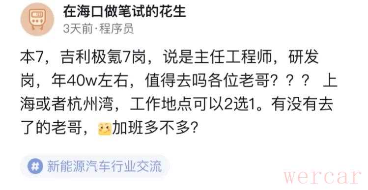 本7,吉利极氪7岗,说是主任工程师,研发岗,年40w左右,值得去吗各位老哥??? 上海或者杭州湾,工作地点可以2选1。有没有去了的老哥,加班多不多?