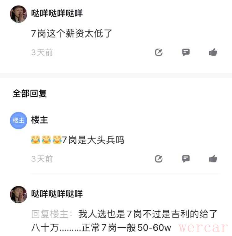 有网友说,7岗这个薪资太低了,我人选也是7岗不过是吉利的给了八十万………正常7岗一般50-60w