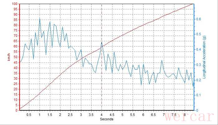 在观察加速曲线图后,可以发现G值变化的曲线与我们实际的动力体验相同。起步初段会有一个“懒惰区”,待0.5S后动力爆发来临,涡轮介入后会提供超过0.6G的G值。然后,整个加速过程动力衔接绵密,没有出现动力中断感。不过也要说明的是,除前中段的出力会特别明显外,后段加速较为平稳。