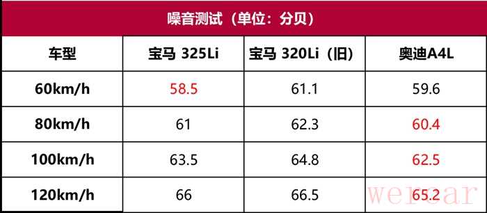 至于得出实际测试结果后,发现的确有不错的进步。单看到低速区间,宝马3系甚至比以NVH著称的奥迪A4L拥有更好的成绩,这很大程度上是因为环境隔音的改善。看来官方所说的一系列隔音材料加成,的确是有疗效的。